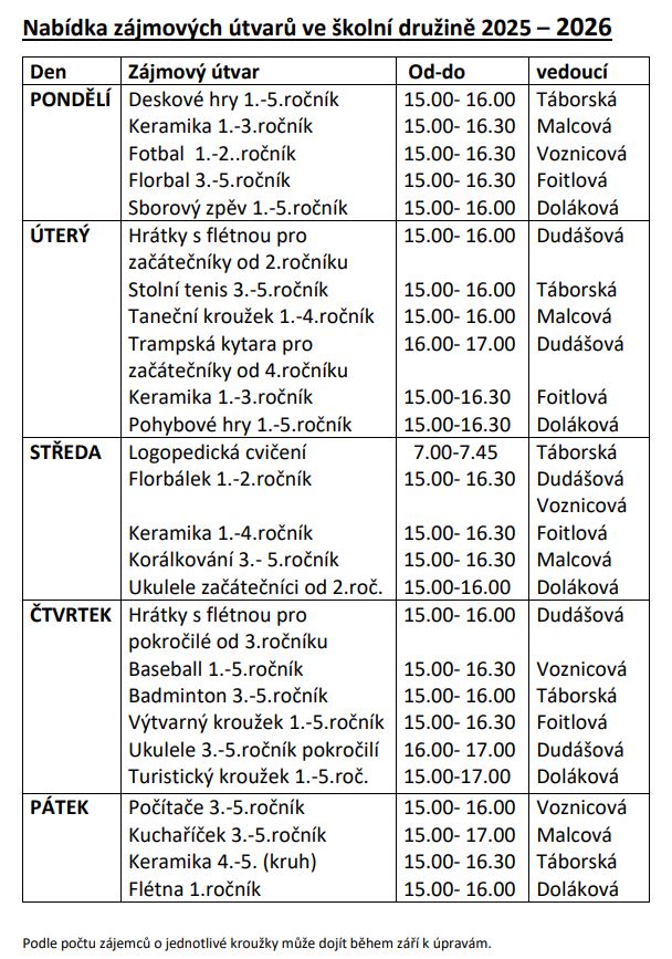PŘIHLÁŠKU DO DRUŽINY A KROUŽKŮ ŠKOLNÍ DRUŽINY DOSTANETE V PONDĚLÍ 1. ZÁŘÍ.