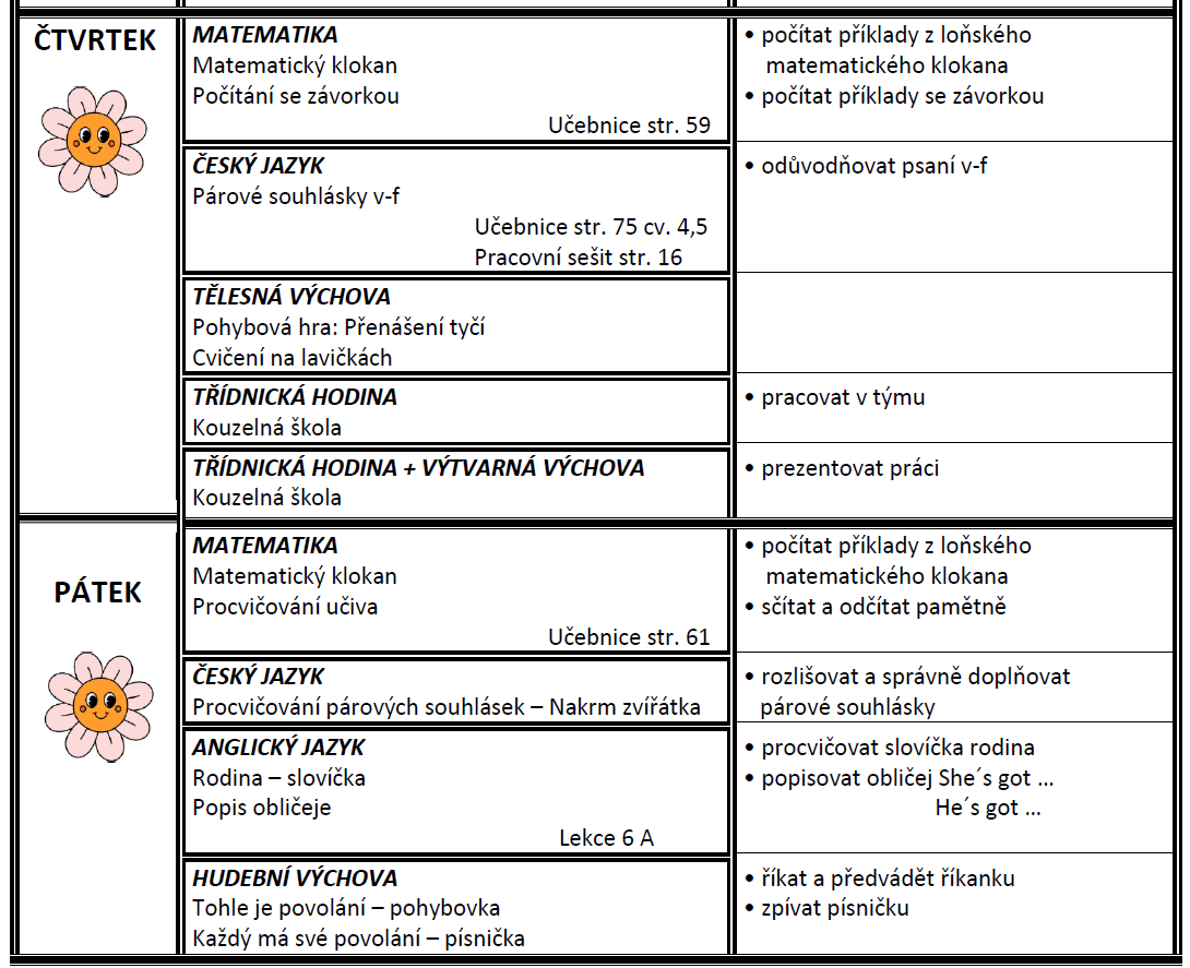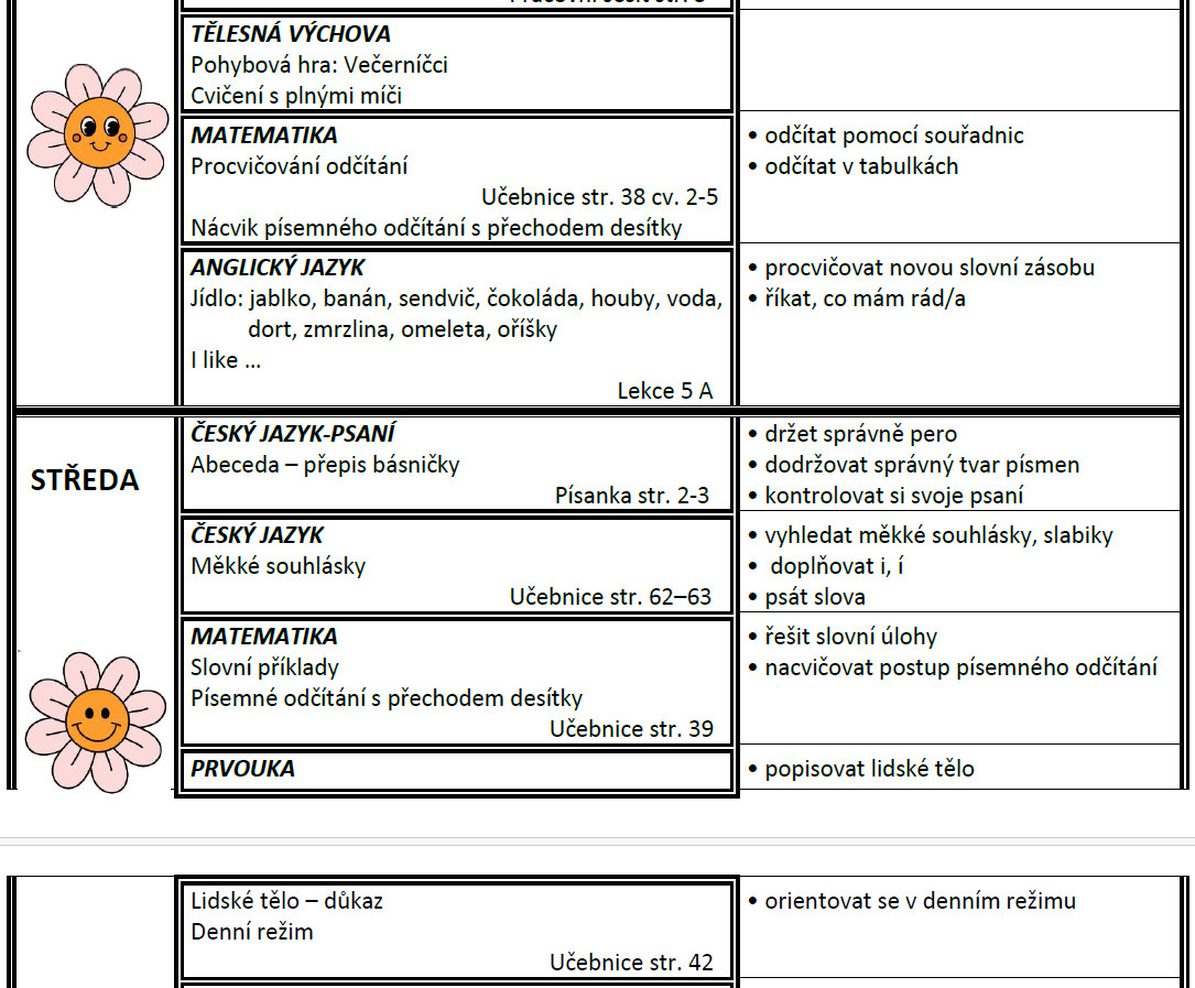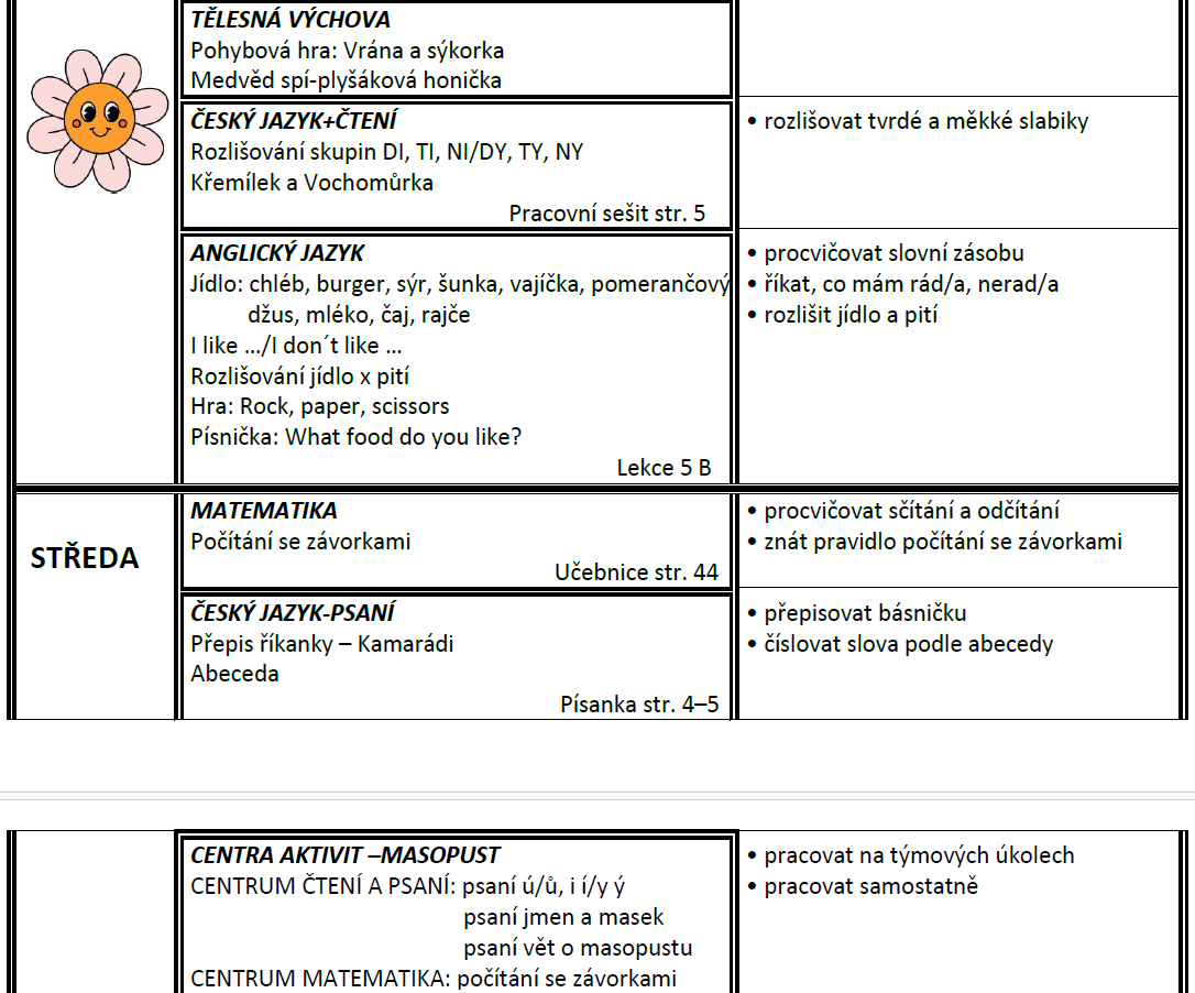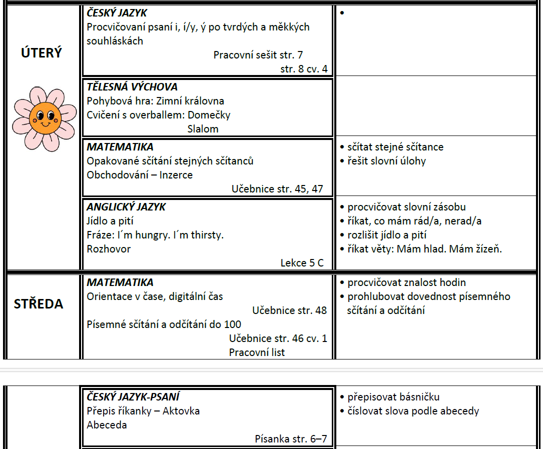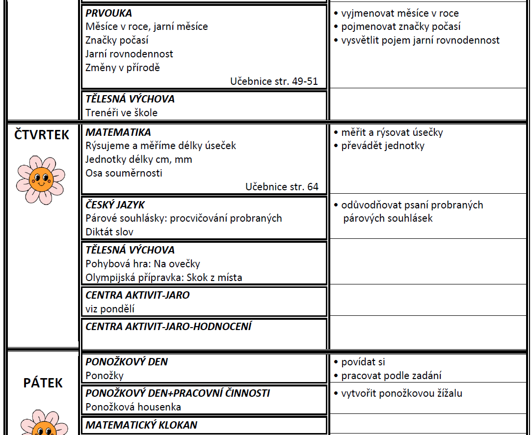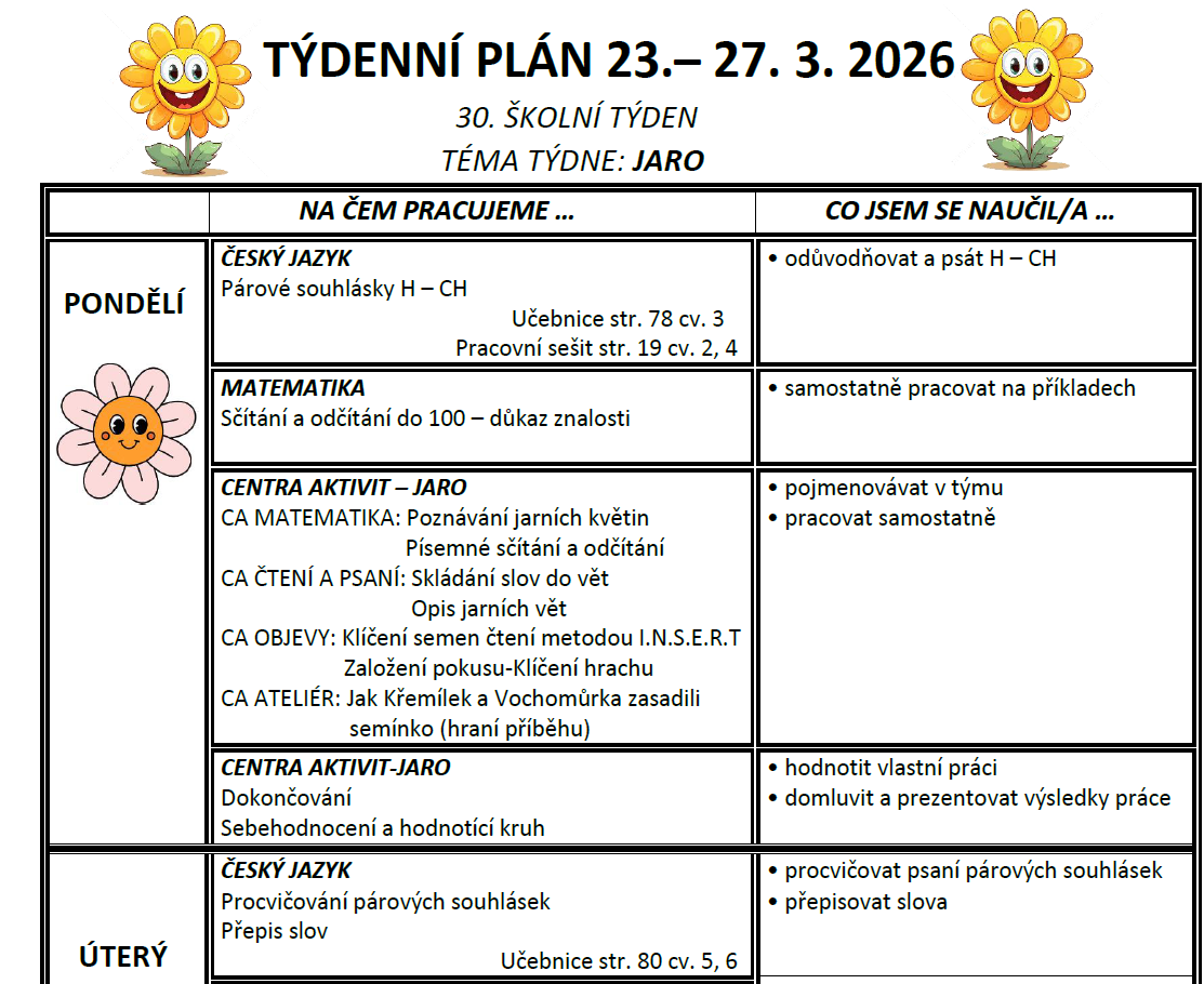 Týdenní plán bude obsahovat učivo na celý týden a výstupy (co by měl žák/žákyně na konci týdne umět).