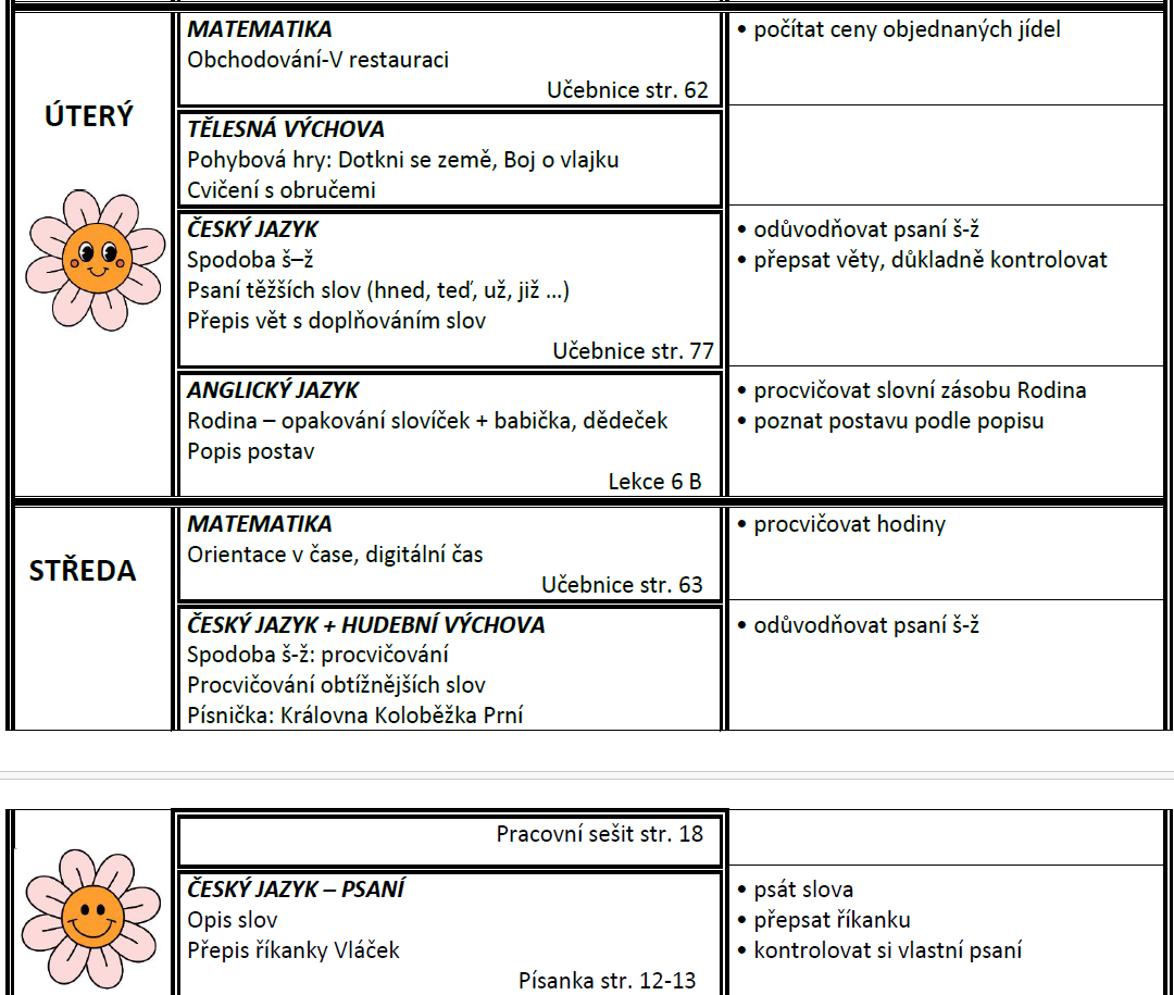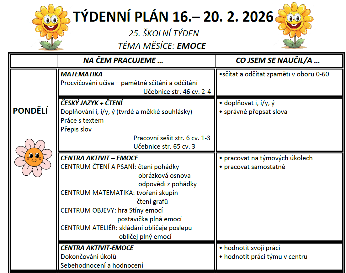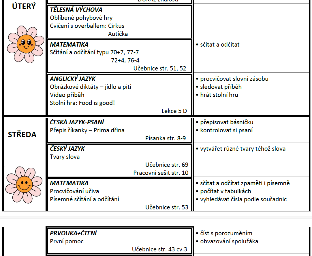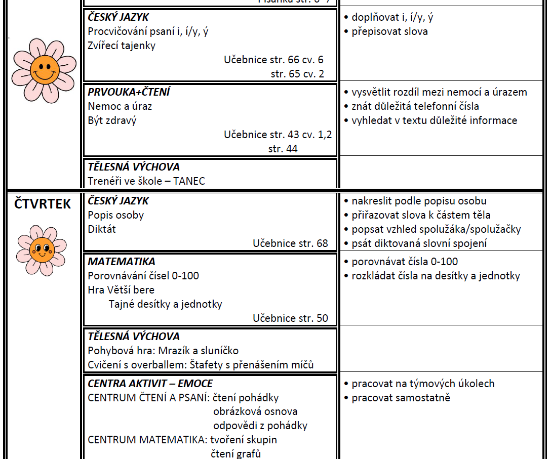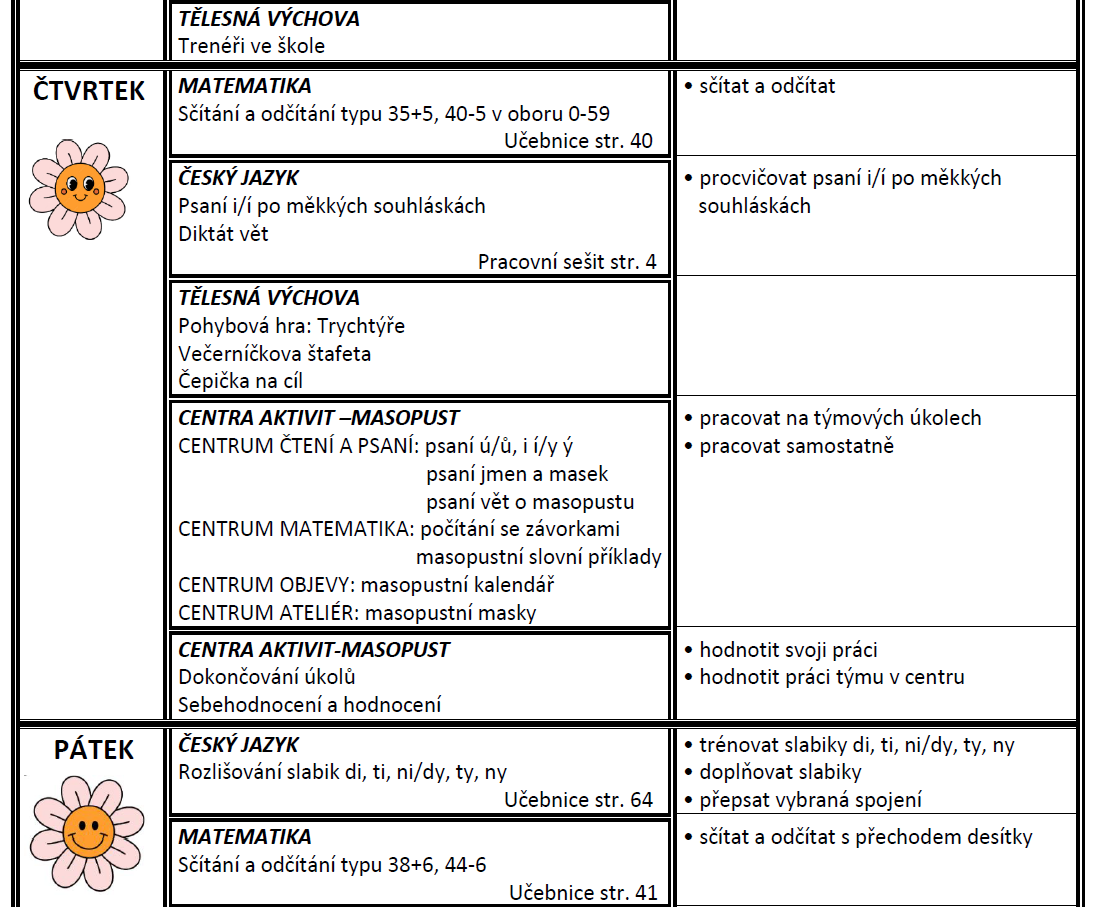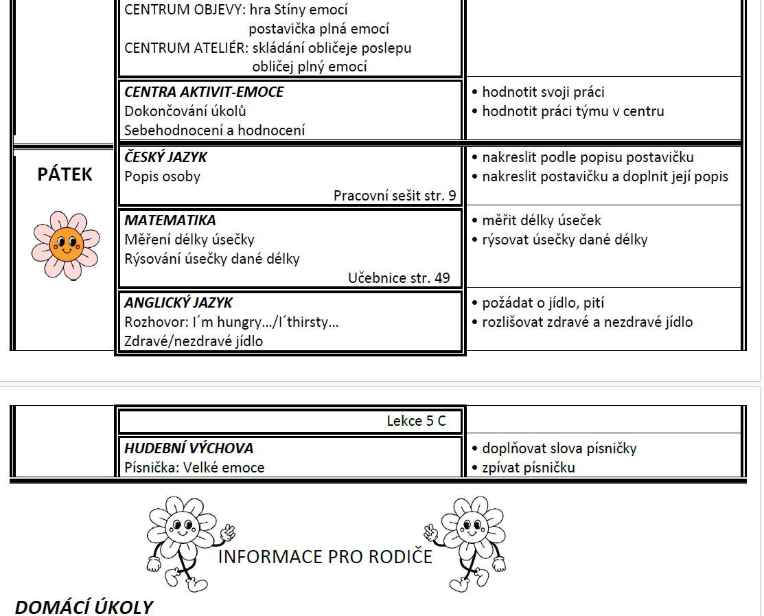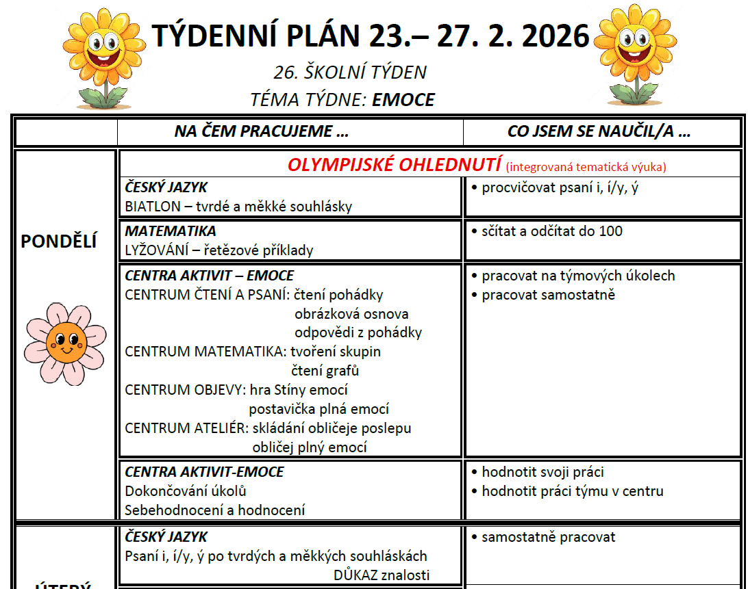 Týdenní plán bude obsahovat učivo na celý týden a výstupy (co by měl žák/žákyně na konci týdne umět).