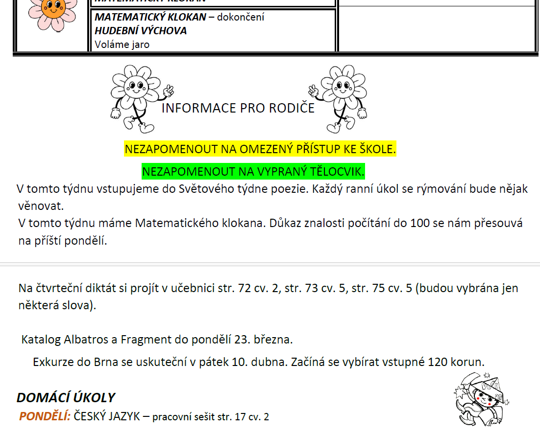 Ke konci týdne bude do žákovské knížky vložen souhlas s naší exkurzí do Brna.